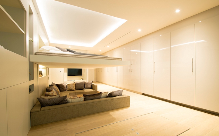 За да могат обитателите на дома да се чувстват еднакво удобно по всяко време на денонощието, дизайнерът предлага холът и спалнята да са в едно помещение – през деня седиш на широк диван, а вечерта върху него се спуска още по-удобно легло. Това е възможно благодарение на малък мотор, който придвижва платформата.
