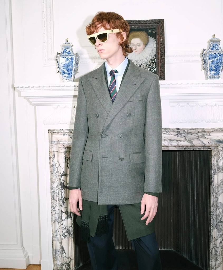 Мъжката мода следва паралелен път на контролирана изтънченост. Прекомерната декорация, която някога характеризираше ранните творби на Микеле, до голяма степен отсъства. Вместо това, тесните, меко ушити костюми в приглушени, римски тонове носят наратива, а техните плавни пропорции внушават лекота, а не строгост. Случайни ексцентричности – сако, наподобяващо роба, брошка с диаманти, закачена на изчистена наметка, или непочтителното присъствие на черни джапанки Rockstud – служат като прецизно дозирани напомняния за вродената театралност на дизайнера, която сега се проявява с дисциплина.