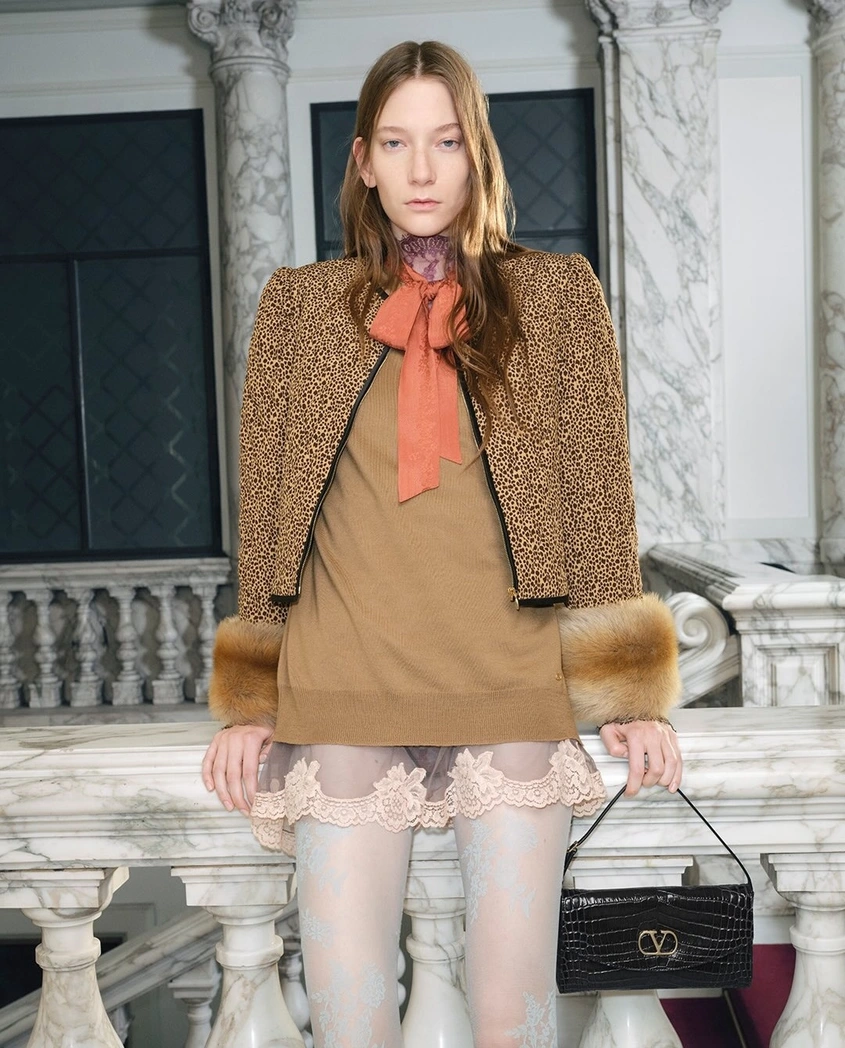 Дантелени подплати се показват под меки кожени бомбър якета, а тънки палта от овча кожа се разтварят, разкривайки дълбоки деколтета, оградени с пухкави V-образни яки. Микромини рокли се плъзгат върху вградени бикини и се носят под къси якета Спенсър, като тяхната ъгловата острота се смекчава от контрастиращи панделки. Това взаимодействие – архивен силует и закачлив детайл – определя темпото на дамската мода.