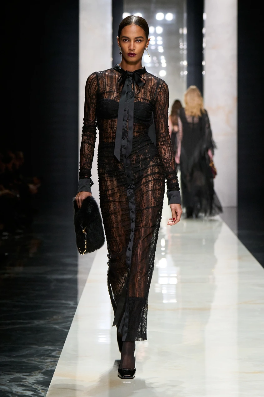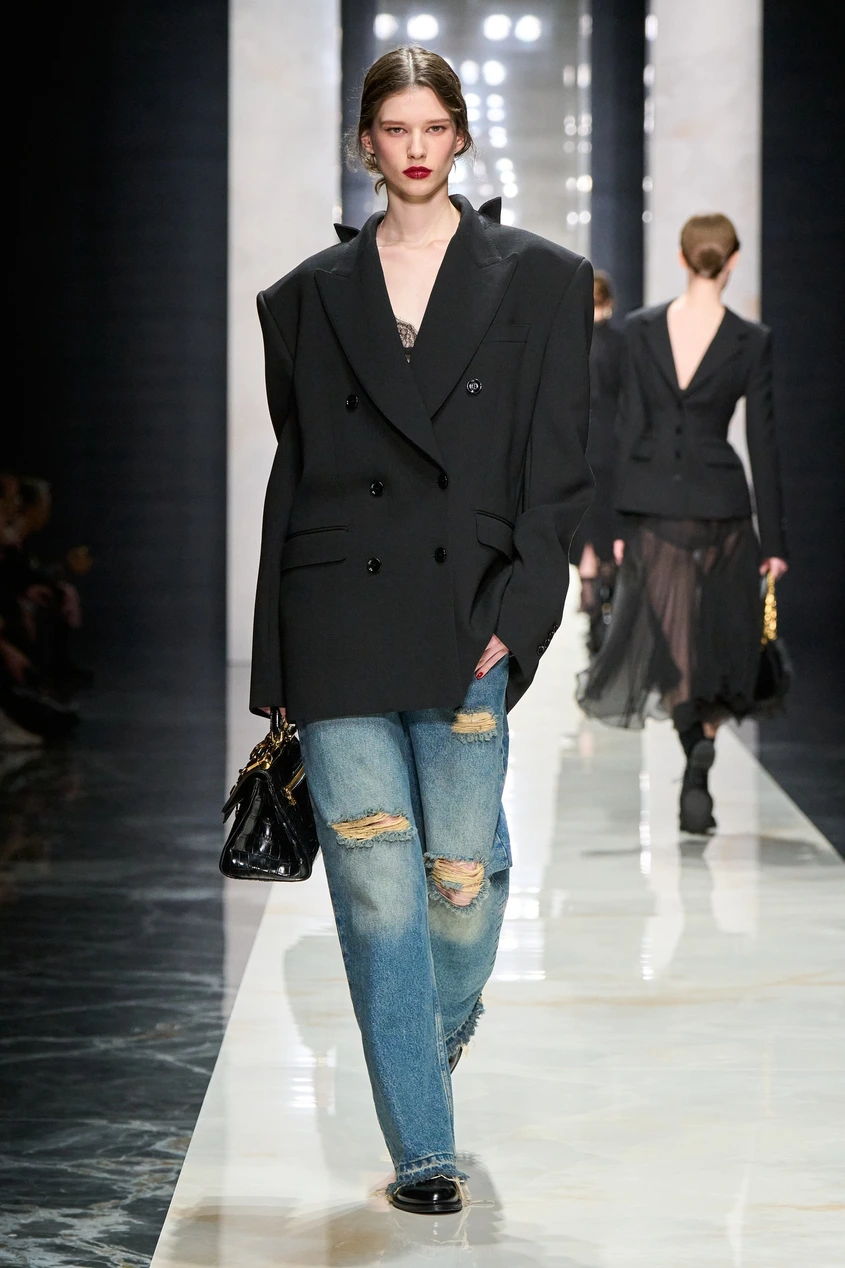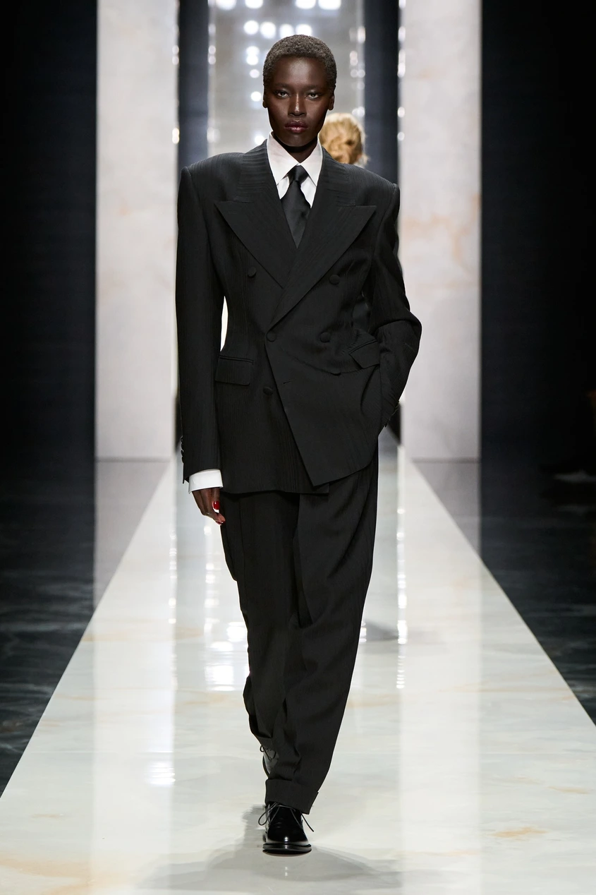 При раменете и високите яки има мъжка прецизност, вплетена в женското тяло. Точно този "диалог", за който D&G говорят – силата на смокинга, която не крие жената, а я подчертава. Това е дреха за човек, който знае точно кой е.