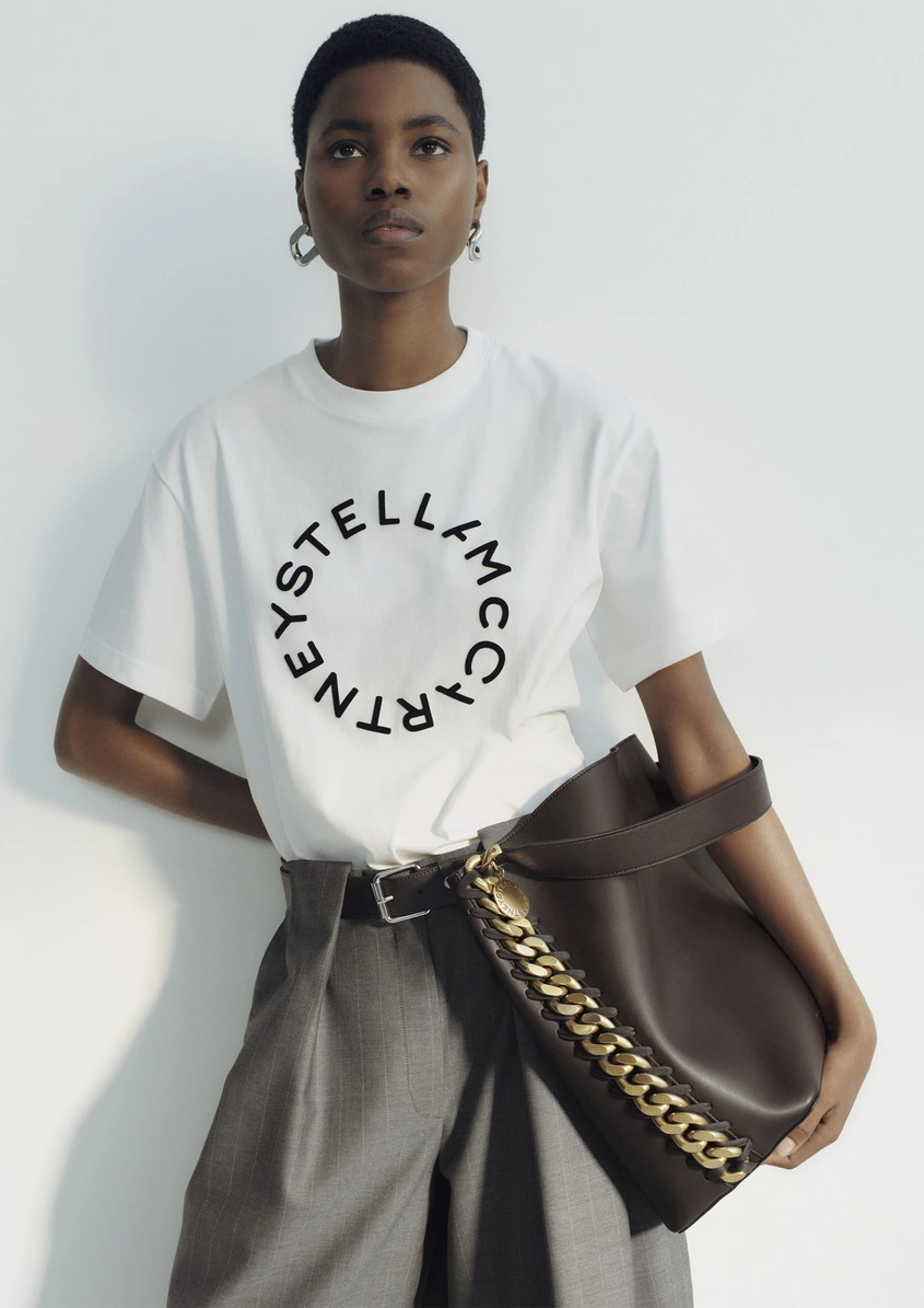 Колекцията среща миналото и настоящето, съчетавайки характерни съвременни силуети – обемни ризи, ефирни връхни дрехи и прецизно скроени линии – с акценти от архивни модели на Стела Маккартни, сред които емблематични десени и топове със слогани.