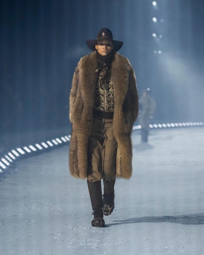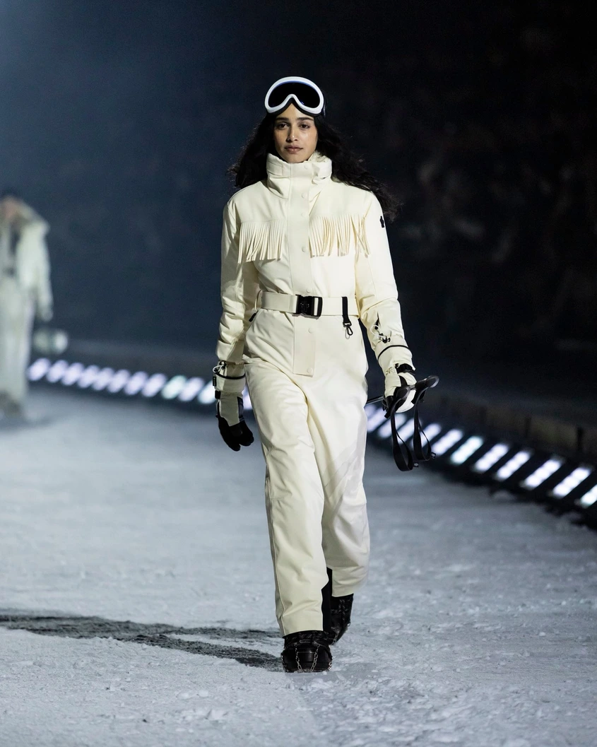 Джиджи Хадид откри ревюто и зададе тона на процесията от модели – много от които облечени в карирани ризи-якета – които се движеха по заснежената писта. Западните препратки бяха навсякъде в колекцията, от шапки с широка периферия в стил Стетсън – които вече са толкова разпространени в Аспен, колкото и ски каските – до каубойски Moon Boots, част от продължаващото сътрудничество на Moncler с марката за обувки. Аспен се появяваше като повтарящ се мотив в принтове и лазерно изрязани детайли, а илюстрирана карта на града, допълнена с диви животни, беше разпръсната по наметала и шалове.