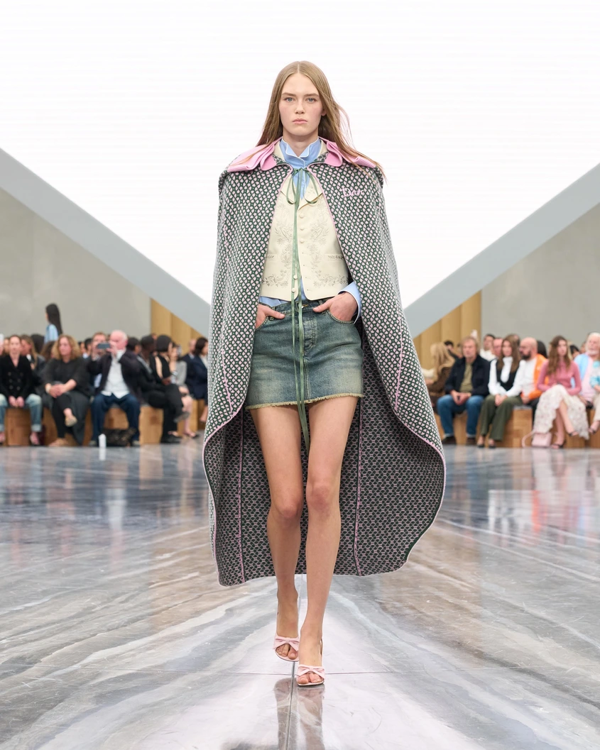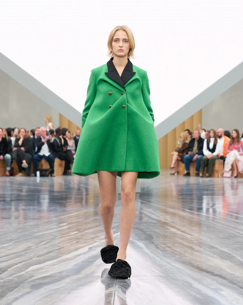 Делфин Арно, председател и главен изпълнителен директор на Christian Dior Couture, седеше между първата дама на Франция Бриджит Макрон и Джони Деп, дългогодишното лице на най-продавания парфюм на марката Sauvage. Над сивия мраморен подиум се извисяваше обърната пирамида, на която беше прожектиран филм преди ревюто на британския режисьор Адам Къртис, известен с документалните си филми за индивидуализма, властта и срива на идеологиите от 20-ти век, включително The Century of the Self, HyperNormalisation и наскоро излезлия през 2025 г. сериал Shifty, който разглежда края на 20-ти век във Великобритания под управлението на консерваторите. Съставен от архивни кадри в неговия характерен атмосферичен стил, краткият филм събра моменти от почти осемдесетгодишната история на модната къща – от клипове на самия Кристиан Диор до колекции от дизайнерите, които го последваха, включително Джон Галиано и Мария Грация Киури, които преминаха през екраните в началото на шоуто (смесени със сцени от филми на ужасите, които придаваха усещане за тревожност, пулсиращо в цялата работа на Къртис).