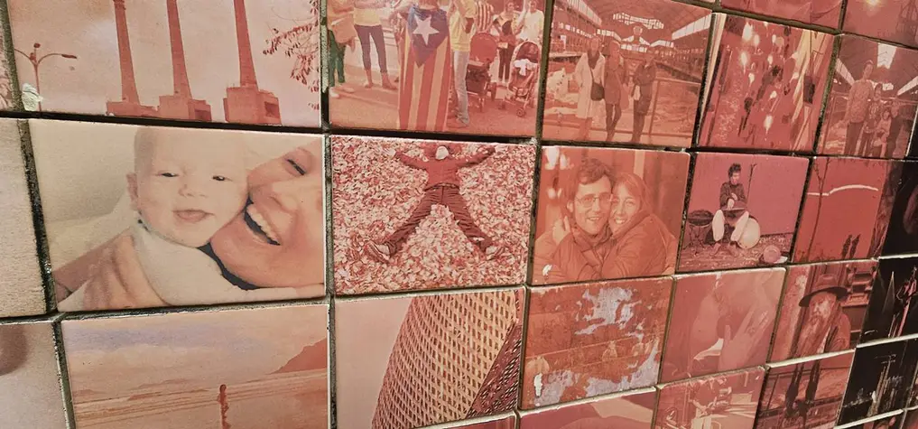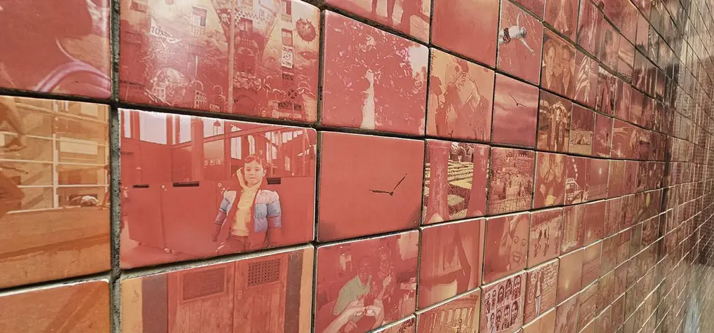 Хиляди парчета керамика. Малки квадратчета, подредени плътно като клетки под микроскоп. Отблизо се виждат – нечии лица, плажове, знаме, което се вее от вятъра... "Ян става на две". Чужди спомени, които не те засягат. Но правиш пет крачки назад и хаосът се подрежда в две устни, застинали върху стената на стара фасада.
