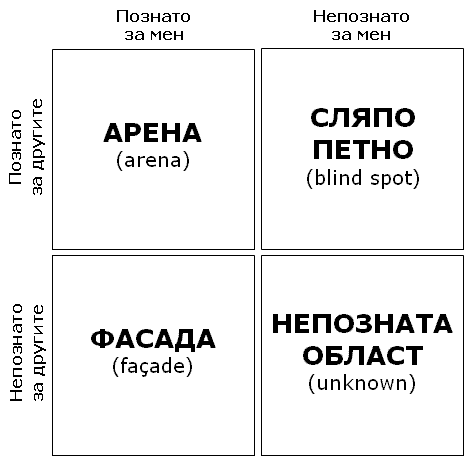 Авторите представят това визуално - като прозорец, разделен на четири квадранта: арена, сляпо петно, фасада и непозната област.