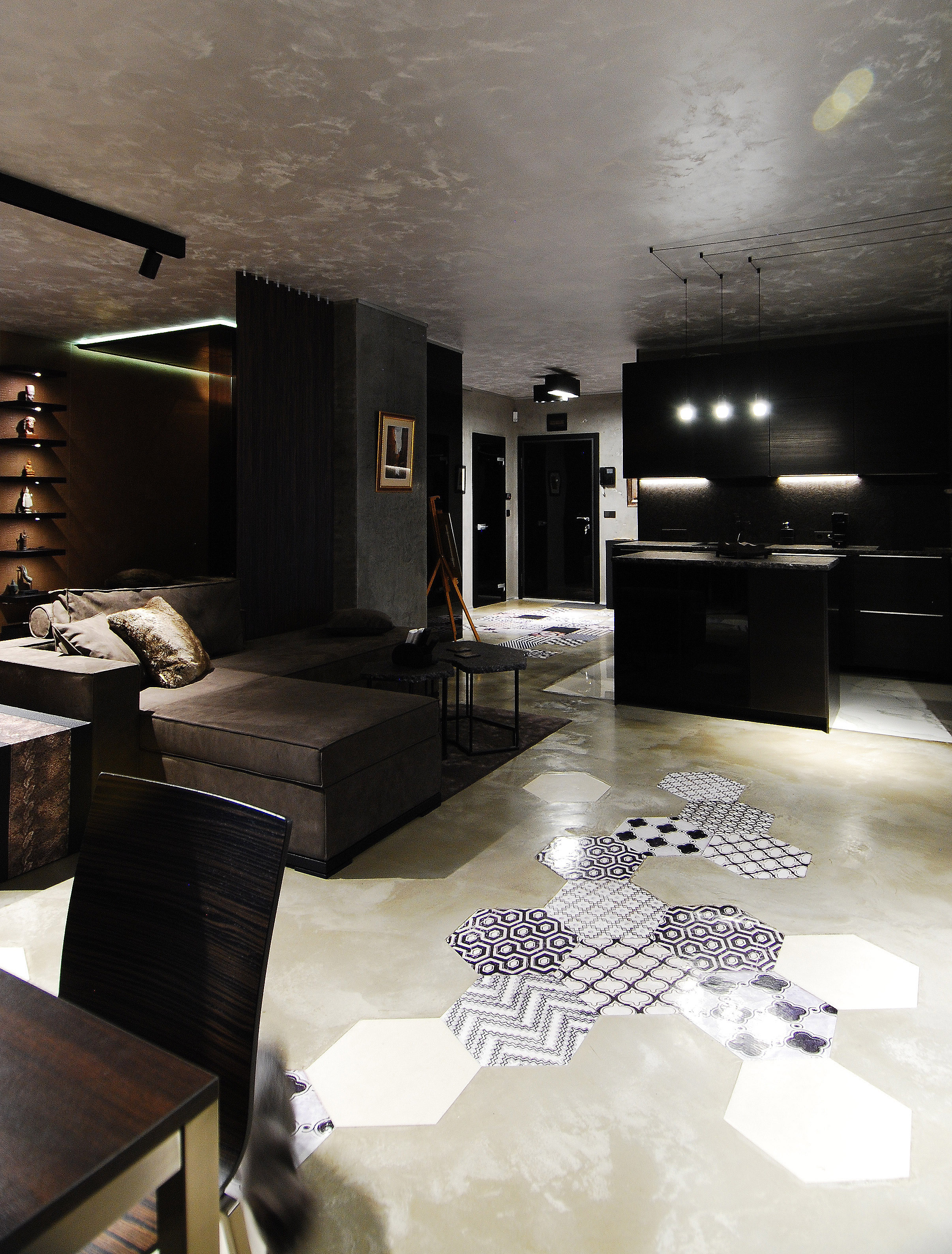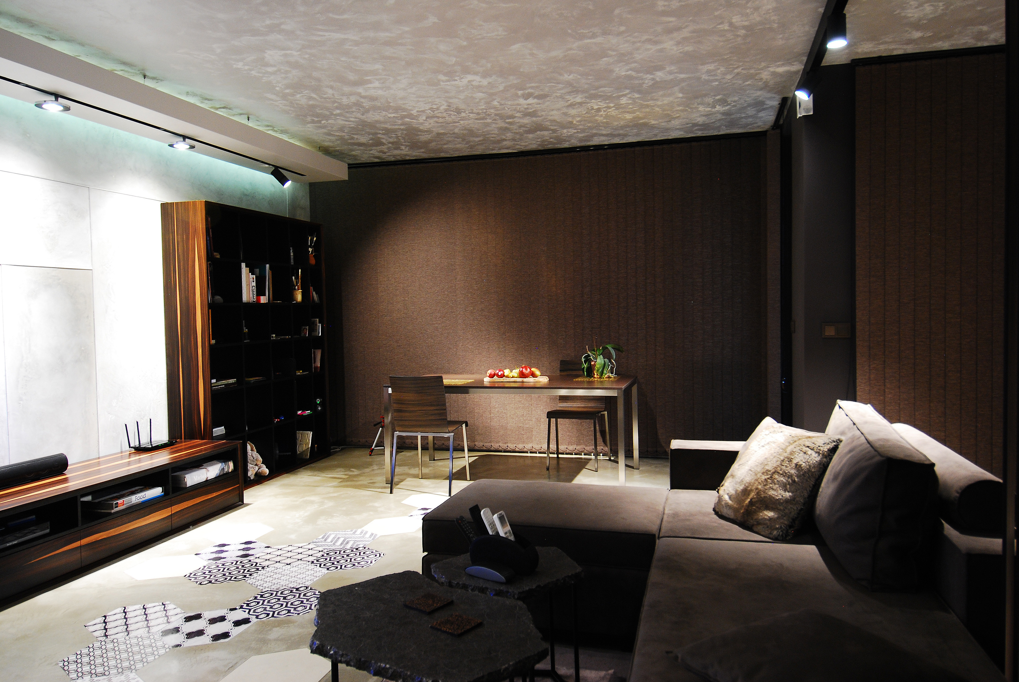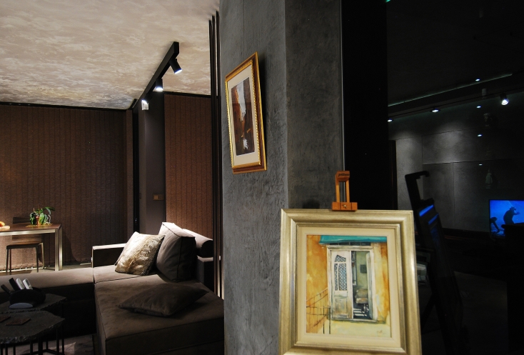 Работният кът изпъква на фона на бетонова стена, а входната част естествено преминава във вътрешното пространство на жилището, благодарение на вградените в бетоновия под рисувани орнаменти, имитиращи състарена теракота.