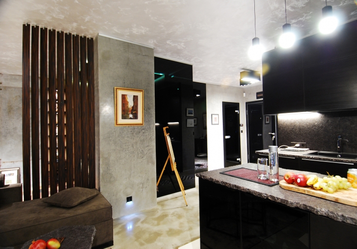 Каменните плотове са с текстура на кожа и ръбовете им са оставени нарочно необработени. Мебелите са произведени от български фирми по проект на дизайнера, с особено внимание към детайла. Осветлението е специално подбрано.