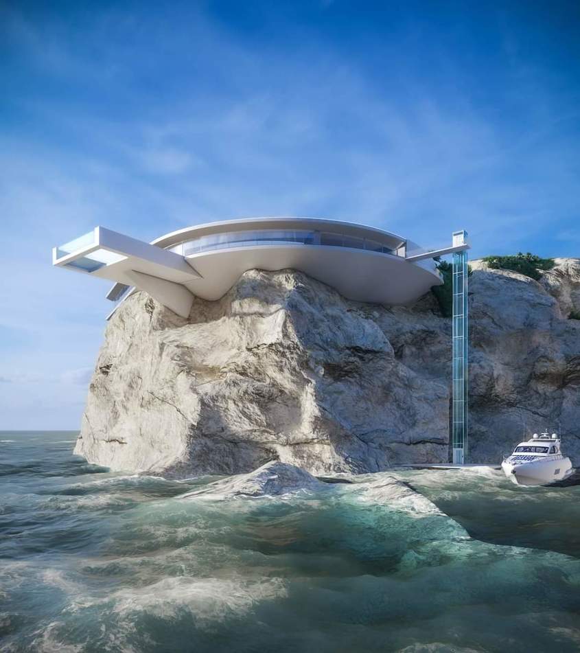Луксозният имот изглежда така, сякаш е удобно разположил се на скалата, за да черпи сили от гледката на открия океан.