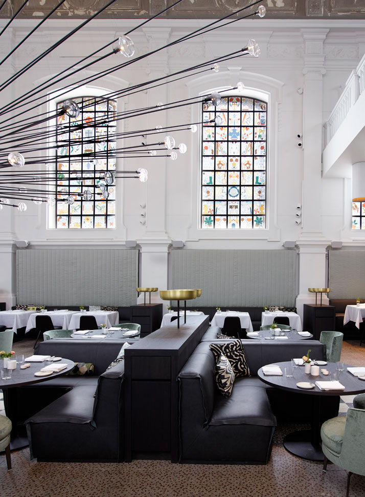 Дизайнерите са решили да запазят част от интериора на църквата - оригиналната мозайка на пода, както и сводестия таван, които по шикозен начин контрастират на новото обзавеждане на заведението. Впечатление прави и оригиналният полилей в залата за хранене, който разполага със 150 крушки.