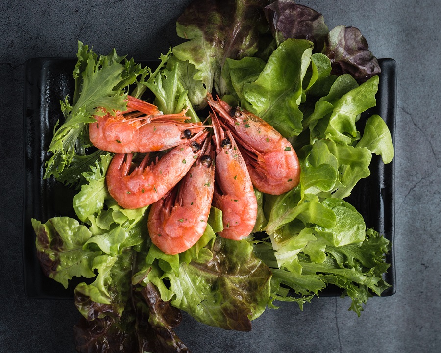 Запържваме скаридите в малко масло, след което ги почистваме и нарязваме на ситно. Измиваме зелената салата и я накъсваме, към нея прибавяме нарязаните червени чушки, царевицата и лука нарязан на полумесеци.