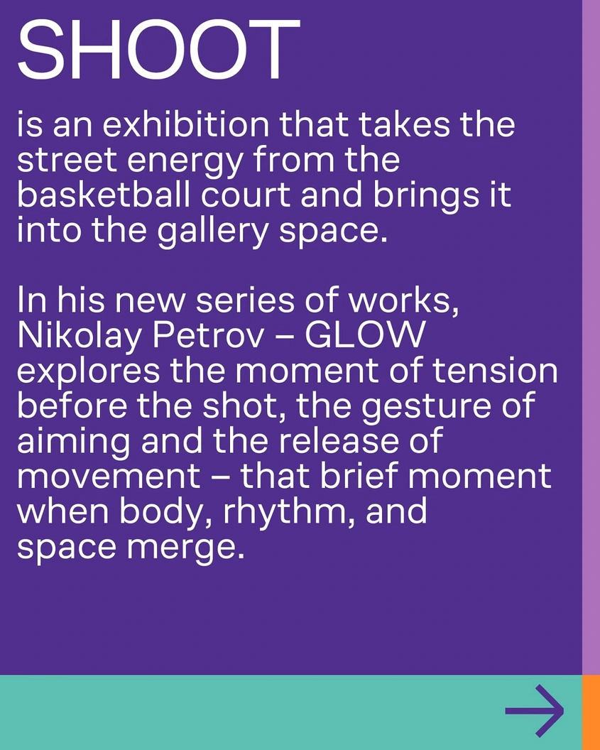 SHOOT е покана за прицелване – не към коша, а към тънката границата между градското изкуство и съвременната визуална култура. Изложба за фокуса, риска и увереността да поемеш изстрела, дори когато теренът постоянно се променя.