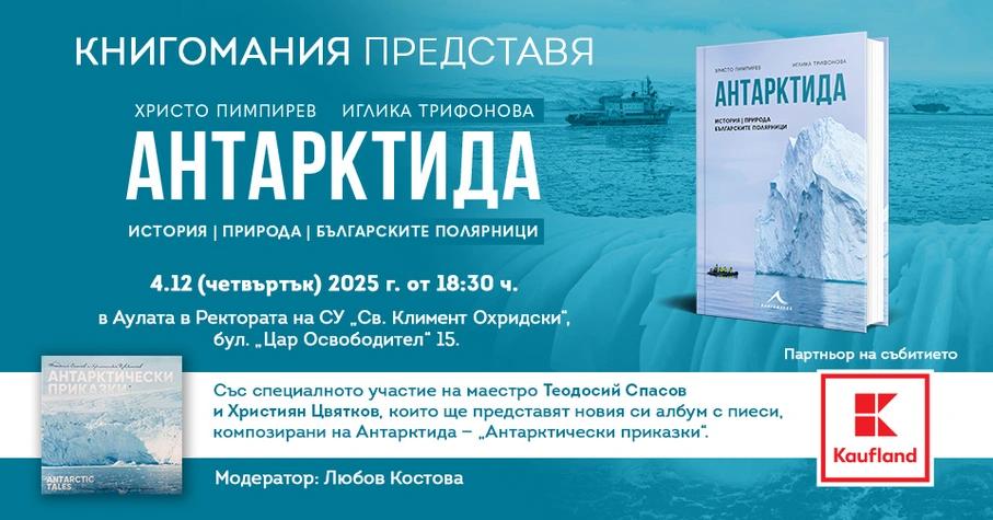Издателство „Книгомания“ представя новата научнопопулярна енциклопедична книга „Антарктида“ – впечатляващ разказ за най-непознатия континент на планетата и за българското присъствие сред ледения безкрай. Автори са проф. Христо Пимпирев и Иглика Трифонова – имена, които от десетилетия свързваме с българската полярна история, както и с книгите „Антарктическият стопаджия“(2024 г.).