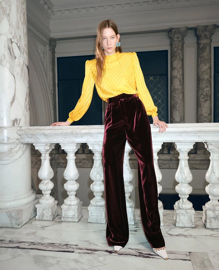 Речникът на Валентино от 80-те и 90-те години на миналия век осигурява структурната основа. Прецизно изрязаните рамене ограждат елегантни мини рокли в смели цветови блокове, чиято простота се усилва от умишленото отсъствие на принтове или тежки украшения. Мателираните повърхности и кадифените ръбове придават дълбочина, без да преминават в разкош. Буржоазното ежедневно облекло се появява с кристална точност – незабавно противопоставено от тихите, непочтителни интервенции на Микеле.