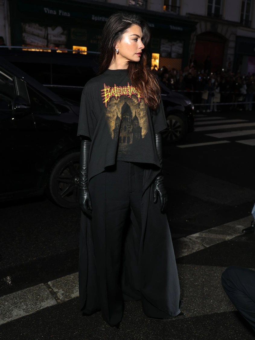Ан Хатауей привлече всички погледи със своето изключително и неочаквано облекло, което перфектно улови духа на новата Balenciaga. Известна със своя елегантен и класически стил, актрисата демонстрира дързост и бунтарство, появявайки се с огромна, черна графична тениска, която се превръща в дълъг шлейф отзад.