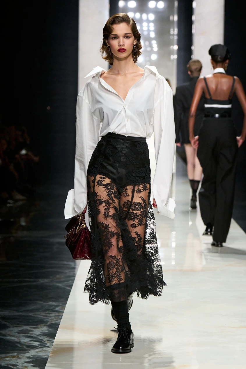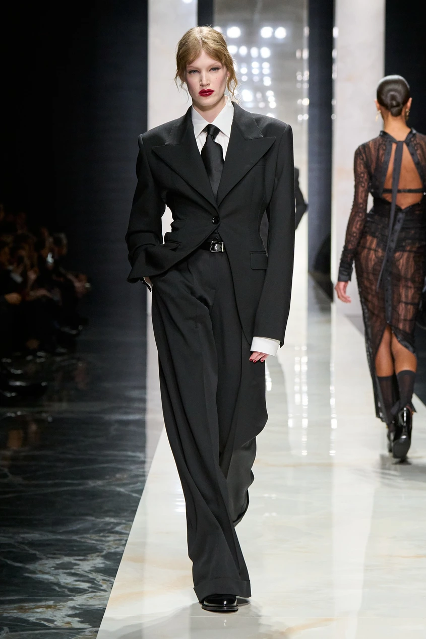 При раменете и високите яки има мъжка прецизност, вплетена в женското тяло. Точно този "диалог", за който D&G говорят – силата на смокинга, която не крие жената, а я подчертава. Това е дреха за човек, който знае точно кой е.