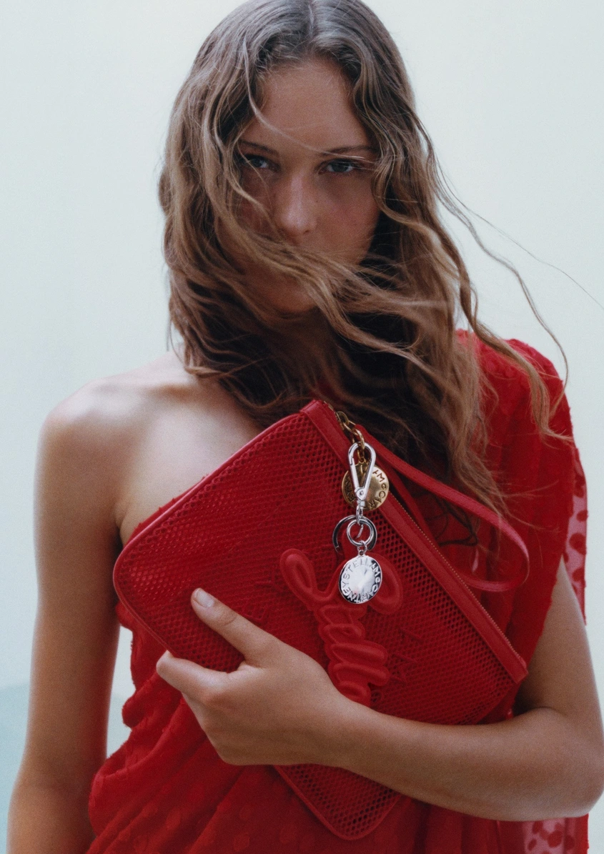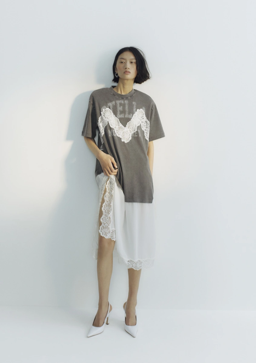 Колекцията среща миналото и настоящето, съчетавайки характерни съвременни силуети – обемни ризи, ефирни връхни дрехи и прецизно скроени линии – с акценти от архивни модели на Стела Маккартни, сред които емблематични десени и топове със слогани.