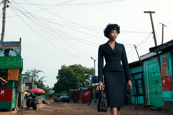 Британският фешън идол позира облечена в стилни едноцветни тоалети, сред които преобладават къси сака, съчетани с поли под коленете. Шик стайлингът на Наоми е дело на Edward Enninful, гримът е на Fulvia Farolfi, а за прическата се е погрижил Jimmy Paul.