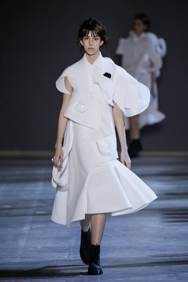 Колекцията на двамата холандци е изцяло решена в бяло, акцентирайки така върху скулптурната структура на дрехите.
